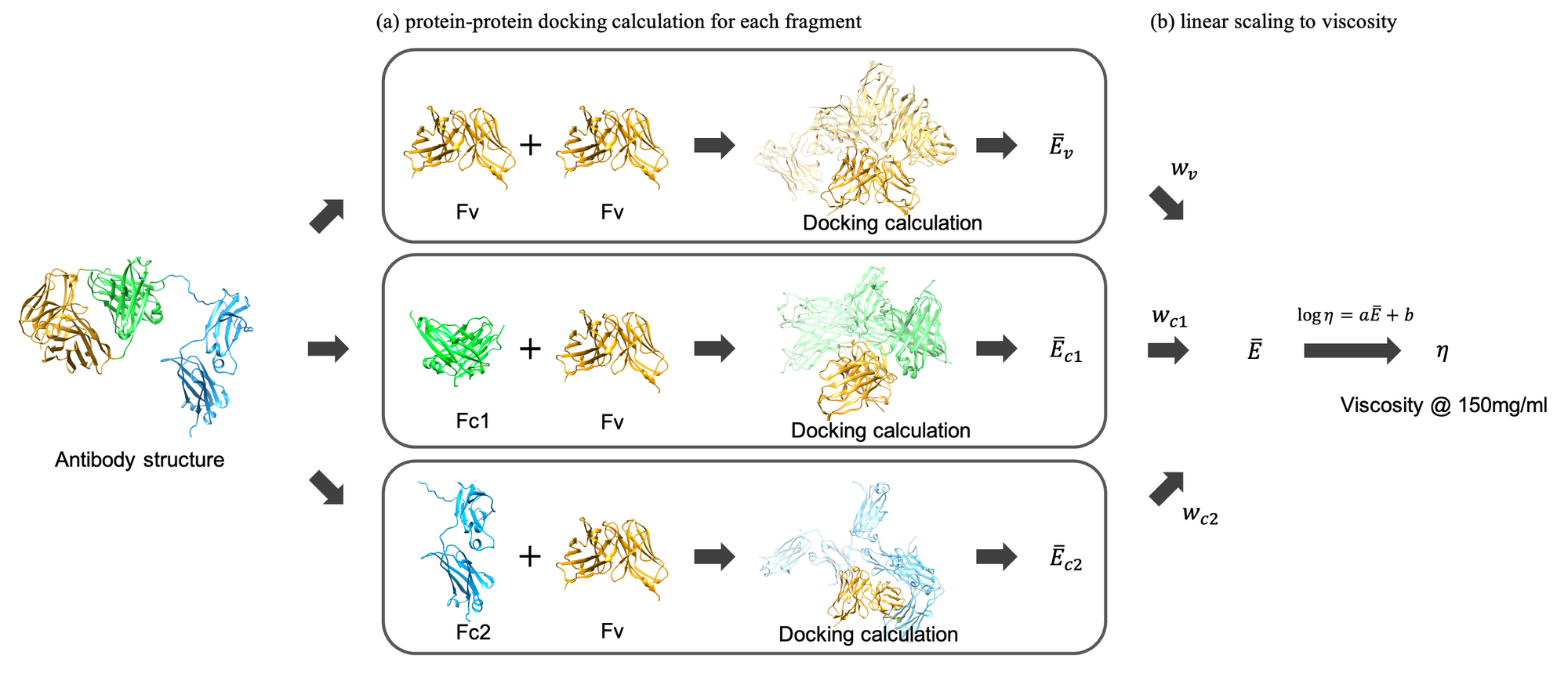 GalaxyAntiVisc calculates the viscosity of antibody solutions from an input antibody structure by performing protein-protein docking calcuation by GalaxyTongDock. It measures the docking affinity between antibody molecules and linearly transforms it to the viscosity value.
