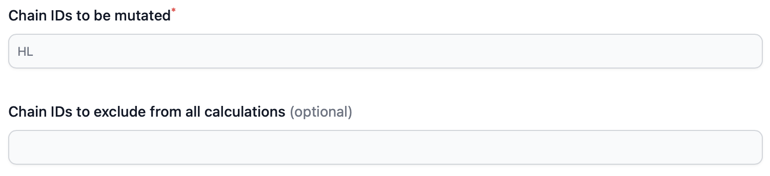 You have to provide chain IDs to be mutated. If you want to exclude specific chains from being considered, you can optionally provide them to the server. Both are comma-separated or concatenated list of PDB chain IDs (case insensitive).