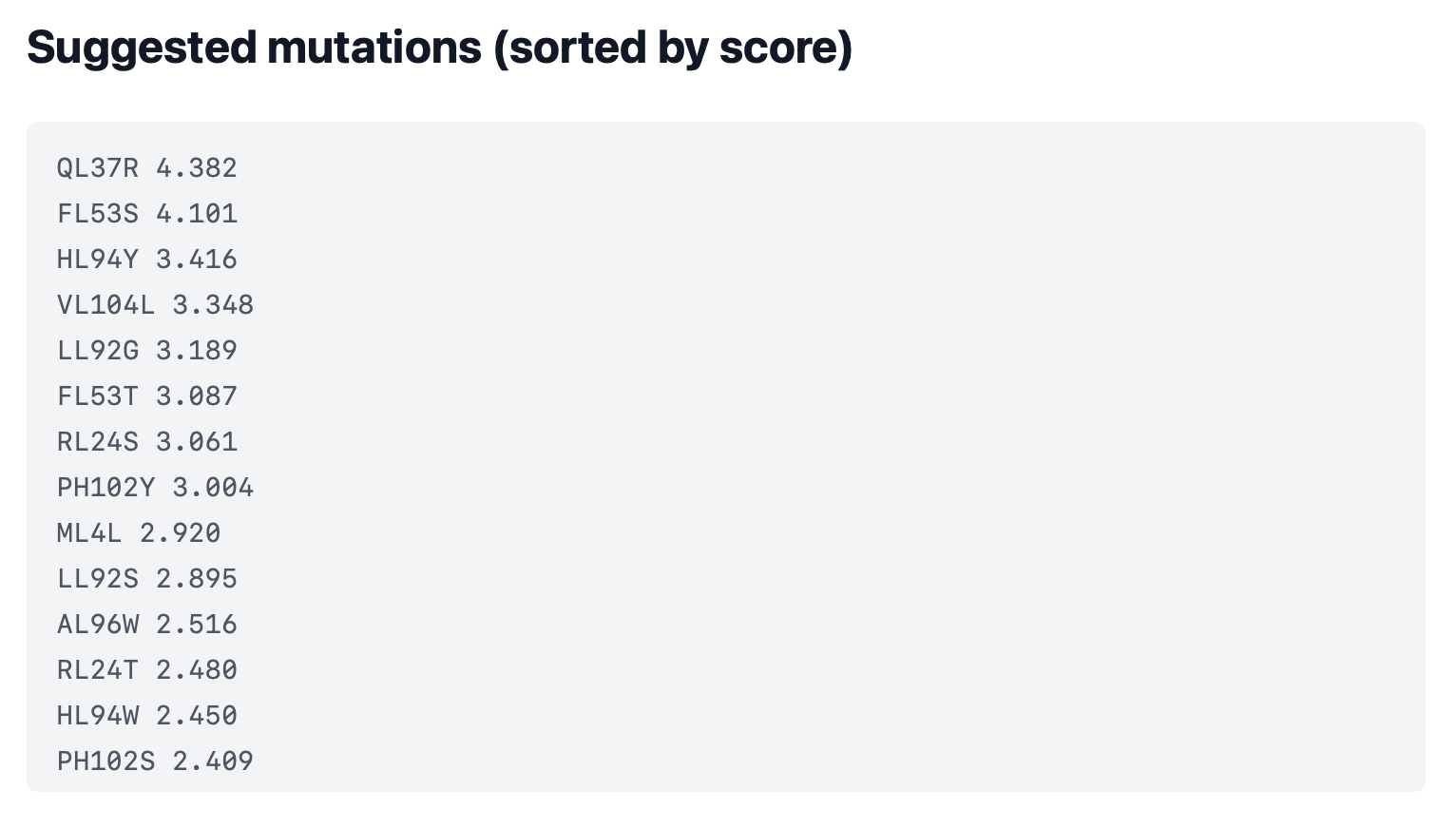 Prefered scores for each mutation by GalaxyActDesign are provided as above figure. The first column identifies each mutation, combining {1-letter code of input amino acid}{chain ID}{residue number}{1-letter code of suggested amino acid}