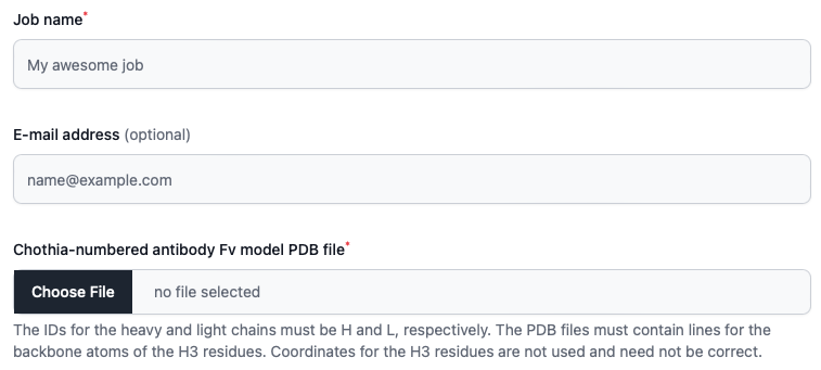 - PDB file: Prepare Chothia-numbered antibody Fv model PDB files. The IDs for the heavy and light chains must be H and L, respectively. The PDB files must contain lines for the backbone atoms of the H3 residues. Coordinates for the H3 residues are not used and need not be correct.