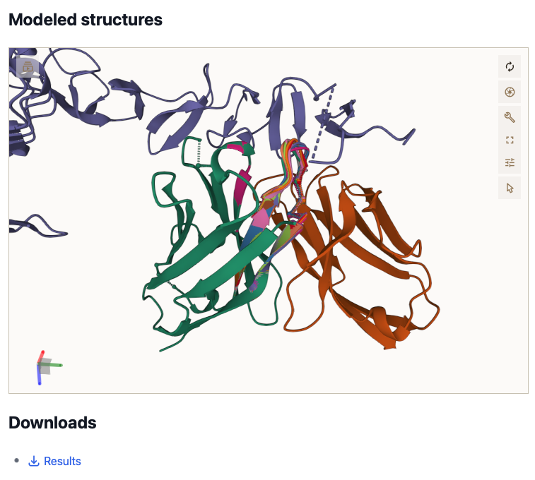 The method will output 16 model structures in PDB format. Only backbone atoms for the H3 loop are generated. Returned model structures are not physically correct (i.e., wrong bond distances and angles) and should be refined before further use.