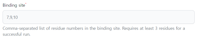 - Binding site: You have to provide probable interface residues at receptor structure as Comma-separated list. Requires at least 3 residues for a successful run.