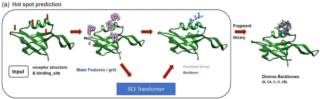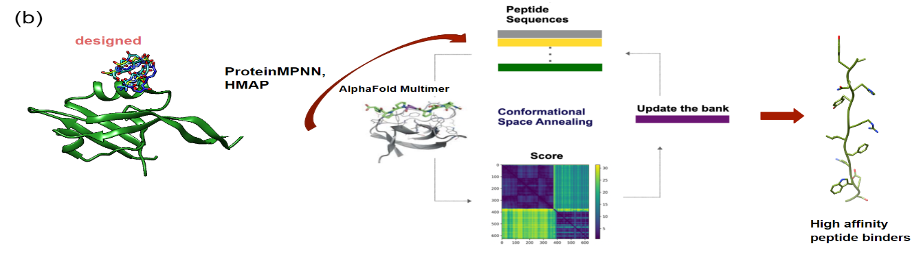 GalaxyPepDesign generates peptide binders from input protein structure and binding site residues by combining information of binding motifs predicted by MotifNet, protein complex prediction with AlphaFold-Multimer and AlphaFold-Multimer confidence score based optimization by Conformational Space annealing.